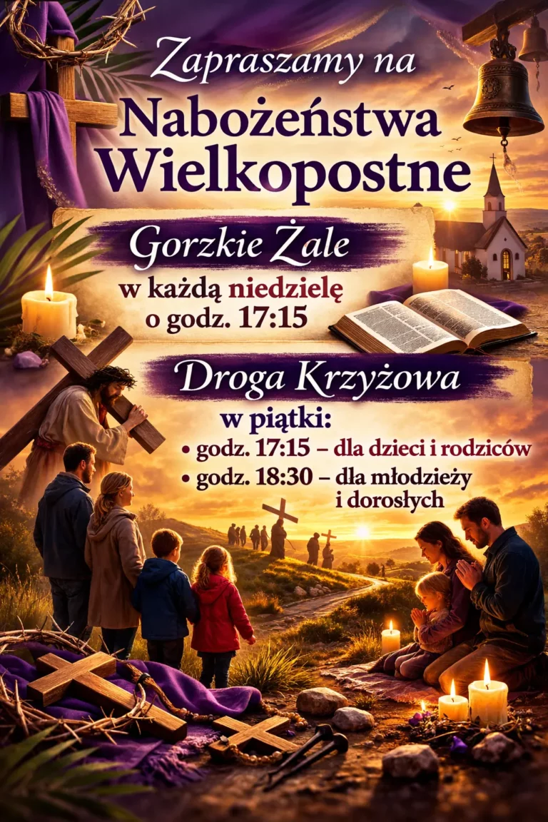 1. Zapraszamy na nabożeństwa wielkopostne Gorzkie Żale w niedzielę o godz. 17:15. Droga Krzyżowa w piątki o godz. 17:15 dla dzieci oraz o godz. 18:30