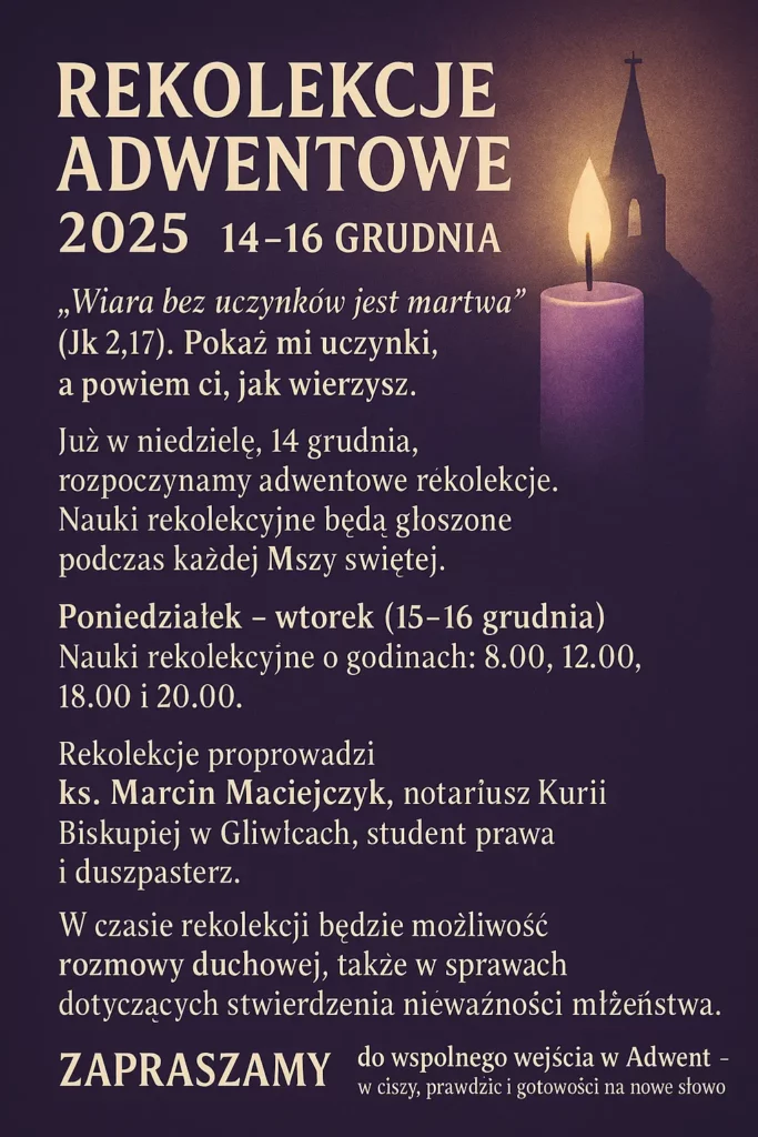 Kochani! Z radością zapraszamy Was na kolejne spotkanie w ramach projektu Małżeństwa Małżeństwom, które odbędzie się 14 grudnia 2025 r. (niedziela). Rozpoczniemy wspólną Mszą Świętą o godz. 13:00, a po niej spotkamy się na rozmowie pod hasłem: „Warci Miłości” – o wartości każdego z nas, o tym jak to wpływa na nasze małżeństwa, a także Bożym […]